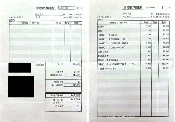 2月5日 43,780円 血液検査、レントゲン、エコー他