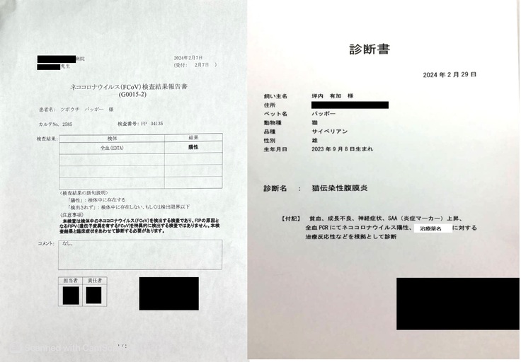 病院から、猫コロナウィルス遺伝子検査の結果として、FIPドライタイプと正式に診断がおりました。