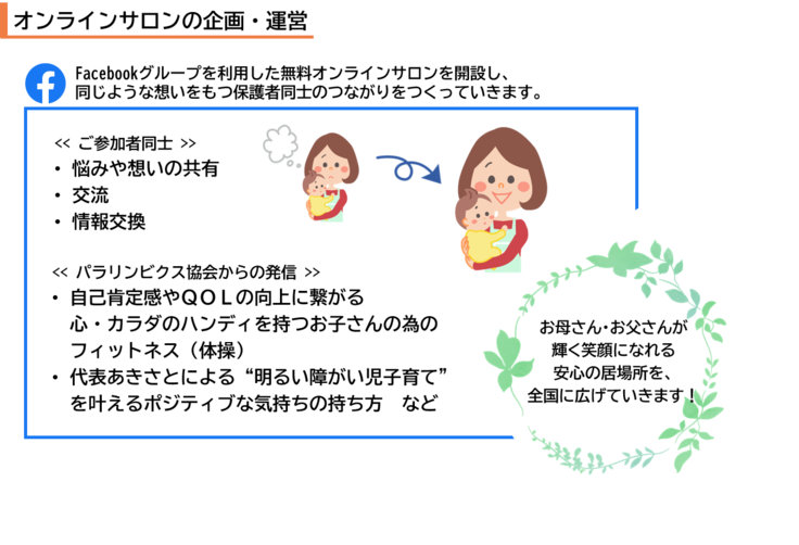 現在、ハンディを持つ子どもたちが短い時間で楽しく取り組むことができ、集中力・自発力のアップ、自己肯定感・QOLの向上が期待できる運動プログラム「パラリンビクス」を伝えると同時に、「お母さんが笑顔でいる事が、子どもにとって何よりのプレゼント!」と考えているため、仕事を制限されがちな障がい児お母さんに、自宅でできる仕事創出の一環としての「パラリンビクスインストラクター養成」に取り組んでいる。