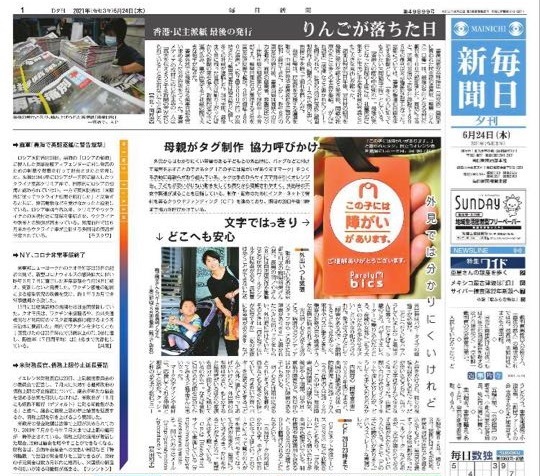 2021年6月24日付毎日新聞夕刊(毎日新聞西部本社発行)の一面で、「この子には障がいがありますマーク」と当プロジェクトをご紹介いただきました!