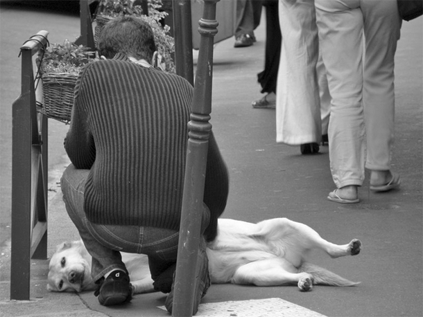 その仕草と表情に、カフェで寛ぐ人たちや通行人まで、皆が思わず笑っていました。