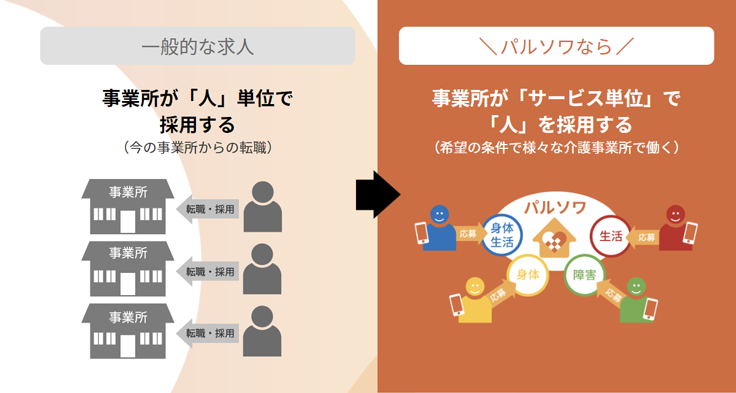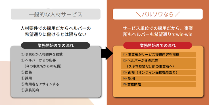 パルソワの仕組みは、サービス業務単位で求人広告を出して採用をしていくため、結果として事業者とヘルパーの両方が、無理なく無駄なく効率的に働くことができるのです。