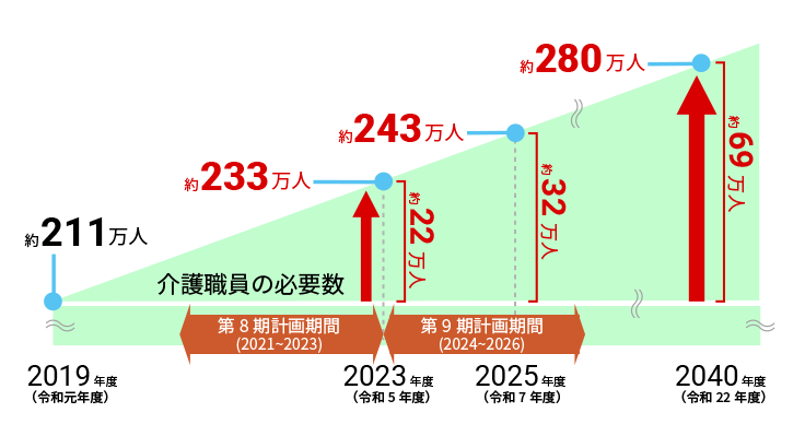 厚生労働省の試算では、2025年には介護職員が約32万人不足するとされています。このままでは、在宅介護で家族と一緒に過ごすことを希望されても、それを叶えることができない状況がやってきます。