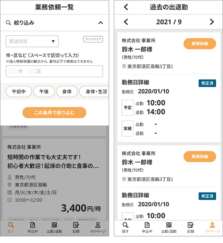 ◆ヘルパー用(スマホアプリ):業務検索、出退勤管理