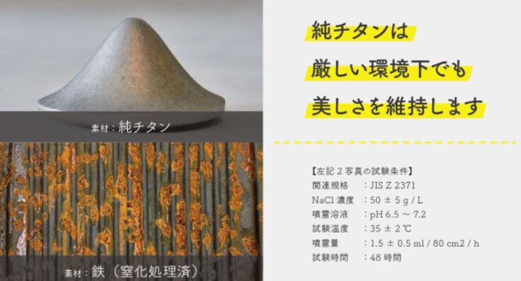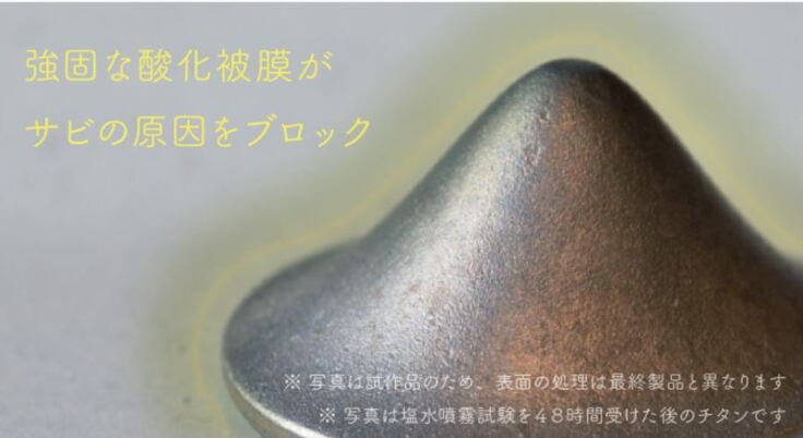 純チタンは、その表面の美しさが長期間に渡って保たれる金属です。鉄やステンレスなどの他の金属と違い、表面が安定した酸化皮膜で保護されているため錆びにくくなっています。