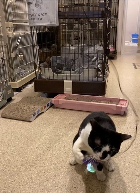 ビビリさんですが、玩具が大好きで遊びながらタッチが出来るようになりました。チップちゃんのほうから近づいてきてくれるようになりゴロンとお腹も見せてくれたり。このようなことが私たちのお世話の励みになっています。施設にはいろいろな個性の猫さんがいます。スタッフやボランティアの方々が愛情を注いでくださるおかげでみんな穏やかに過ごすことが出来ています。みんなに素敵なご縁がありますように。