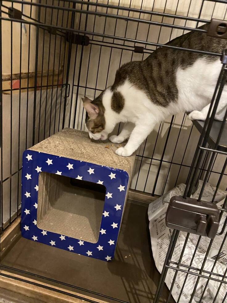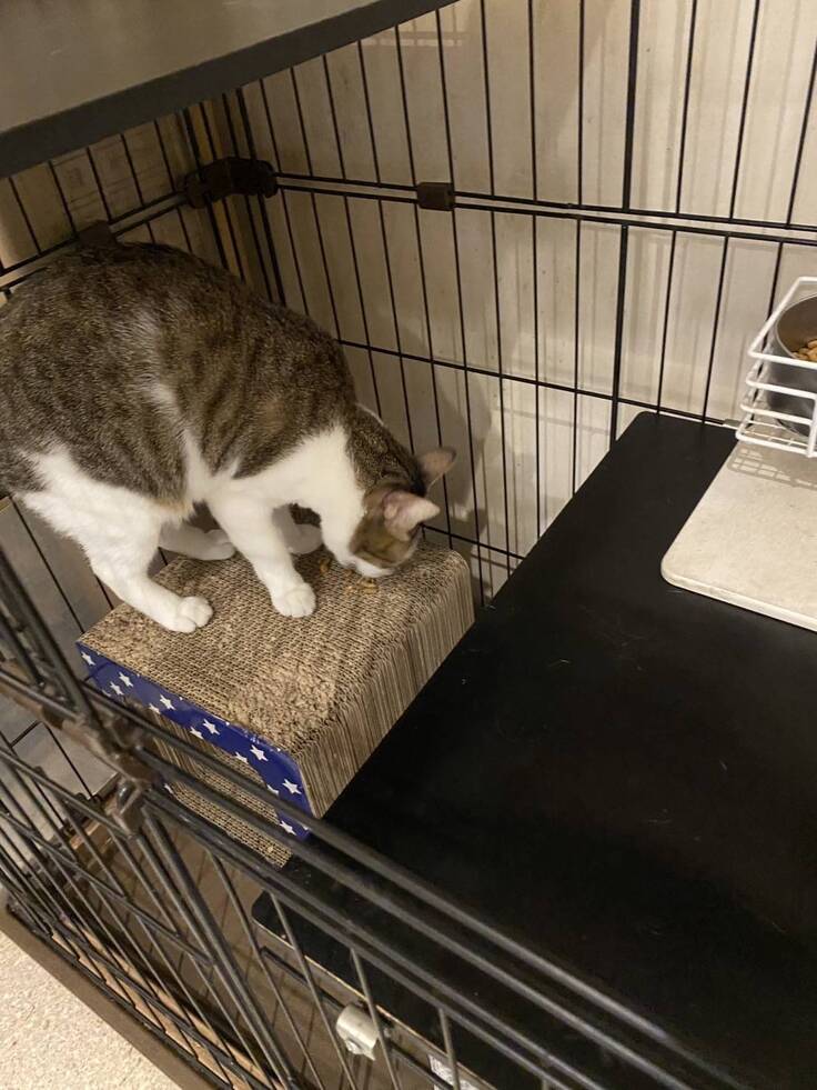 がっちゃんは、カリカリを爪研ぎまで運んで食べるのがマイブームです。