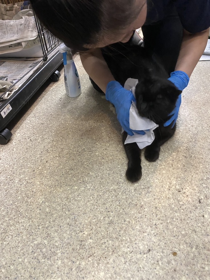 スタッフに目ヤニを拭いてもらう「あいの」ちゃんです。