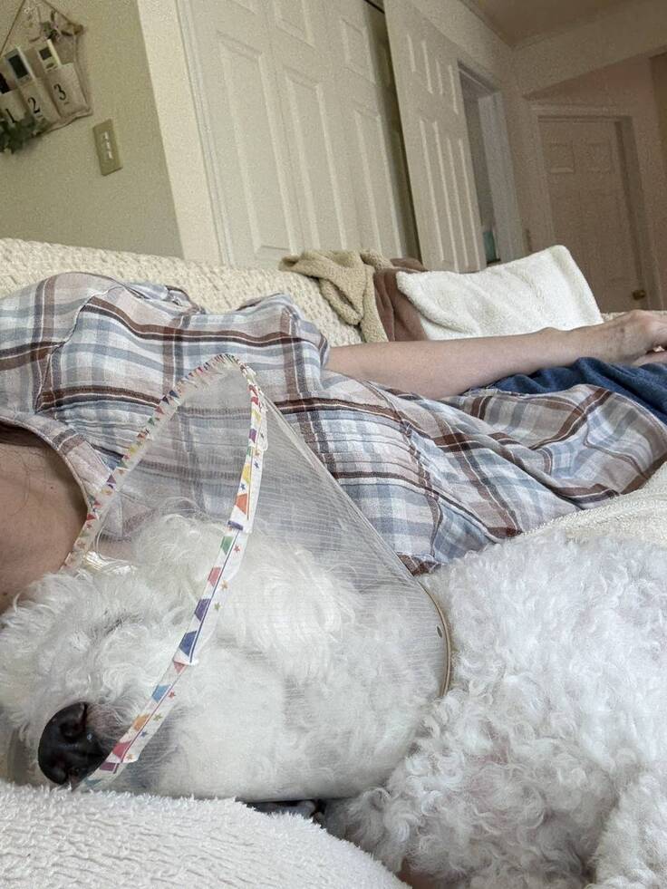 里親さんと添い寝でぐっすり。動物たちひとりひとりの幸せが私たちの財産です。里親さんのお優しいお心、ご尽力に深く感謝致します。