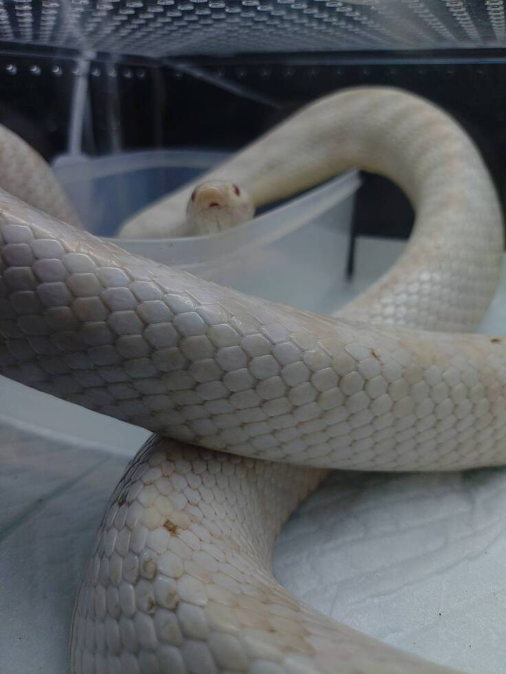 富山県魚津市内でヘビの保護がありました。体長120cm以上の白いヘビです。発見から捕獲、保護までごはんを食べていないそうです。早くゆっくりさせてあげたいです。いつもいろいろな相談にのってくださり、施設の爬虫類や魚たちのごはんを購入させていただいているミシマ高岡店の七尾さんに相談し、預かっていただくことになりました。本当にいつもありがとうございます。