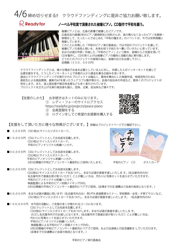 一人でも多くの方に被爆ピアノと広島のピアノ調律師矢川光則さんの活動を知っていただきたいという想いから、このプロジェクトも始めました。