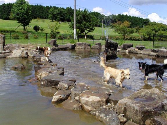 以下、施設外観:犬広大なドッグランや池、噴水で犬たちが元気に遊んでいます。