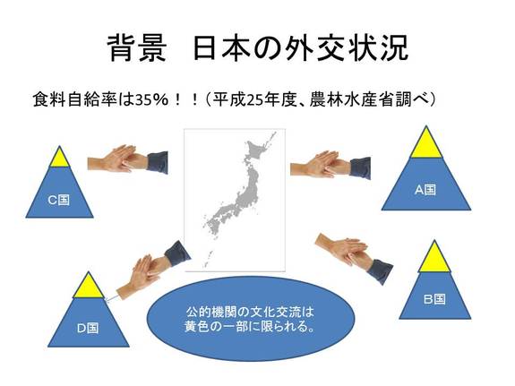 背景としてこの日本の外交状況ですが、一応例として、一番わかりやすい食料自給率を上げます。なんと、35%しかなく、ほとんど輸入頼りです、、きっと、ほとんどの人は外国で生産されたものを口にしていることになります。食料を例にしましたが、現代日本は様々な国と経済的、政治的に結びつき、交流を行っているのです。私たちの身近にある、食料、衣服、機械、文化だって外国との関係によってあるものなのです。それをだれが決めて、やっているのかというと、スライドの黄色い部分のいわゆる権力層(企業、政府)であり、私たち市民は、日常的に他国との結びつきを感じることはあまりないと思います。でも、その物や、情報、文化を消費するのは、多数を占める市民なのです。私たちも、未来になっていくうえで、他国との相互関係を理解しておくことが必要なのではないでしょうか?