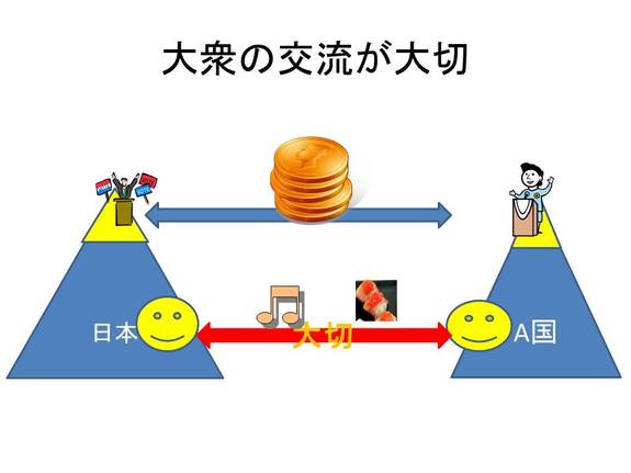 絵で言うとこんな感じです。権力層同士の交流だけなされていますが、私たち、市民同士の交流がもっと盛んになることが、未来を考えるうえで必要だと思います。市民が多数を占め、市民が常にこれからの未来を決めていかなければならないからです。(民主主義)私たちの生活には今や、世界の文化、情報が流れ込んできます。その中で、他国との相互関係を無視することはできないのではないかと私は考えます。市民こそが相互関係を理解しておき、そのうえで政治的意思表明をすることが大切だと思います。