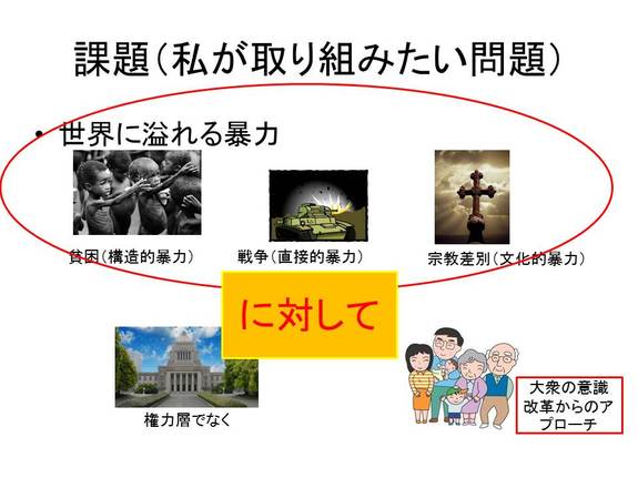 その暴力に対して、権力層などの、上からその問題にアプローチするのでなく、大衆の意識(他に対する認める意識、同じ人間であると感じる意識)を生み出すことで、下から大衆層からのアプローチをしたいです。