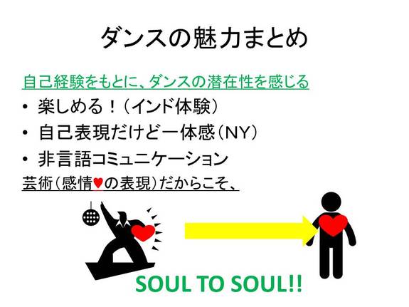 また、ダンスとは感情の表現でもある為、人間の感情を見る人の感情に伝える為、なにか共通的なものを感じることもできます(私もよく、人のダンスをみてジーンときます)それが、国際的な交流活動に活かせないか!?と考えているのです。