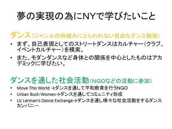 何より、「人種のサラダボール」といわれるアメリカ、特にNY!はダンサーも様々な国から来ており、人々の非言語交流として、音楽空間でのダンスがあることは間違いないです!NYでダンスを学び、ダンスの社会組織で、どのように社会組織に持っていくか、それを学びたいんです!
