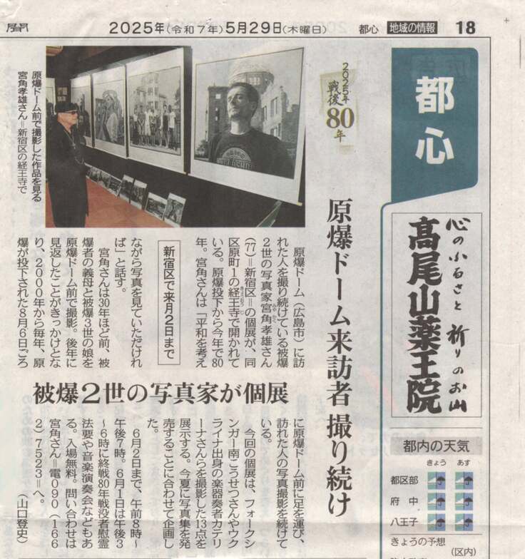 また会期中に東京新聞に掲載いただきましたのを知人から聞き、驚きそしてありがたく今後も写真展や広島での撮影の励みになりました。写真集も7月初めころに完成予定で、7月中には皆様のお手元に届くと思いますのでもう少々お待ちいただけますようお願いします。もし写真集(1冊税込5,280円)を購入希望の方はpeacemiyakaku@gmail.comへメールをいただけますようお願いします。