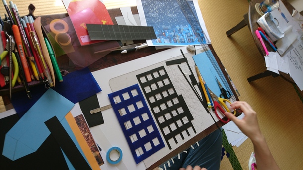 そして、色のついた厚紙をビルの形にカットします。窓も切り抜きます。