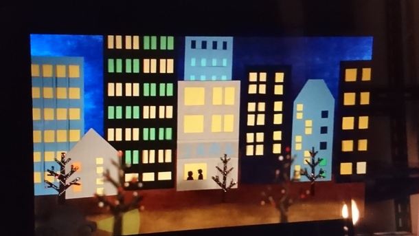 車を少しずつ動かせば、クリスマスの街並みのできあがり。真ん中のビルの1階に、アニメの主人公の2人の影が見えます~。