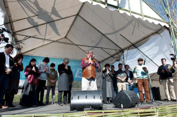 (2013年3月11日震災2周年の黙祷の様子です。C.W.ニコルさん、坂本龍一さん、加藤登紀子さん、後藤正文さんなどにご参加いただきました。)