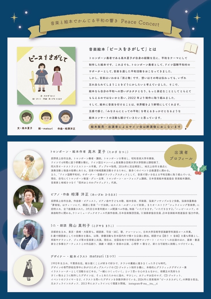 内容:音楽絵本「ピースをさがして」、トロンボーン、うた、ピアノによる演奏、ドイツ平和活動団体「ドイツ国際平和村」の紹介、平和について語る「ピーストークショー」