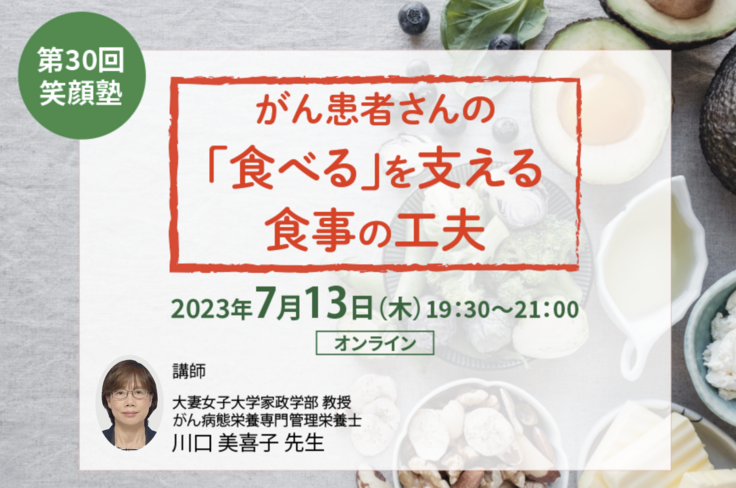 今回は、「がん患者さんの『食べる』を支える食事の工夫」と題し7月13日夜の開催です。
