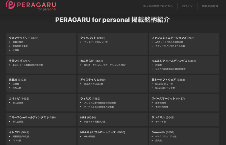 はじめまして。私たちPERAGARUは、上場株式への投資判断に活用するオルタナティブデータを閲覧できるツール「PERAGARU」を開発、運営しており、主にヘッジファンド向けに販売しております。2022年5月より個人投資家向けに「PERAGARU for personal」をローンチ予定です。(PERAGARU for personalのページ)PERAGARU for personalで閲覧できるオルタナティブデータは各上場企業のKPIを日次など細かい粒度で把握できるようになっております。例えば採用SaaS運営企業3991 ウォンテッドリーであれば、同社サービスの有料契約企業数を閲覧でき、当該データと1社あたりの平均契約単価の積で売上高の予測が可能です。「開示情報はすぐにマーケットに反映されてアルファがない。」、「情報収集に膨大な時間がかかる。」といった悩みを抱える投資家も多いと思いますが、投資家はオルタナティブデータを活用することで、決算発表前など迅速な投資判断ができるようになるだけでなく、低いコストで情報収集をすることができます。