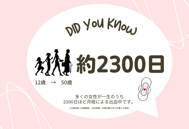 12歳で初経を迎え、50歳で閉経を迎えたとすると多くの女性が一生のうち2300日ほど出血をしているという計算になります。