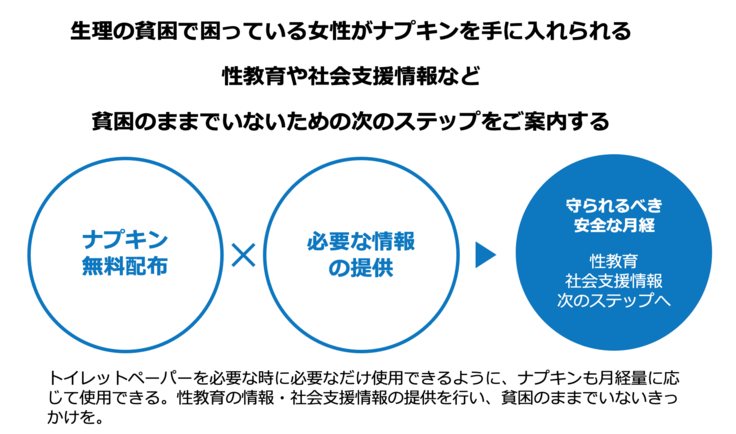 日本国憲法第25条に「国民が健康で文化的な最低限度の生活を営む権利」が規定されていて、私たちは健康に生きるための「生存権」が認められています。「月経」は女性の多くが付き合わなければならないものです。経血量には個人差があり、一ヶ月に使用する生理用品にも個人差があります。 しかし、今の現状だと必要な時に適切な生理用品を使用できず困っている女性がいます。トイレットペーパーをすべての人が使用できるように、月経を経験するすべての女性に適切な生理用品が手に入るような社会になればいいと私たちは願っています。