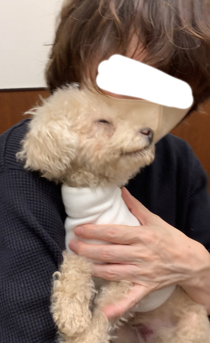 獣医師さんにペロを渡すと、寂しそうな声を出していました。。