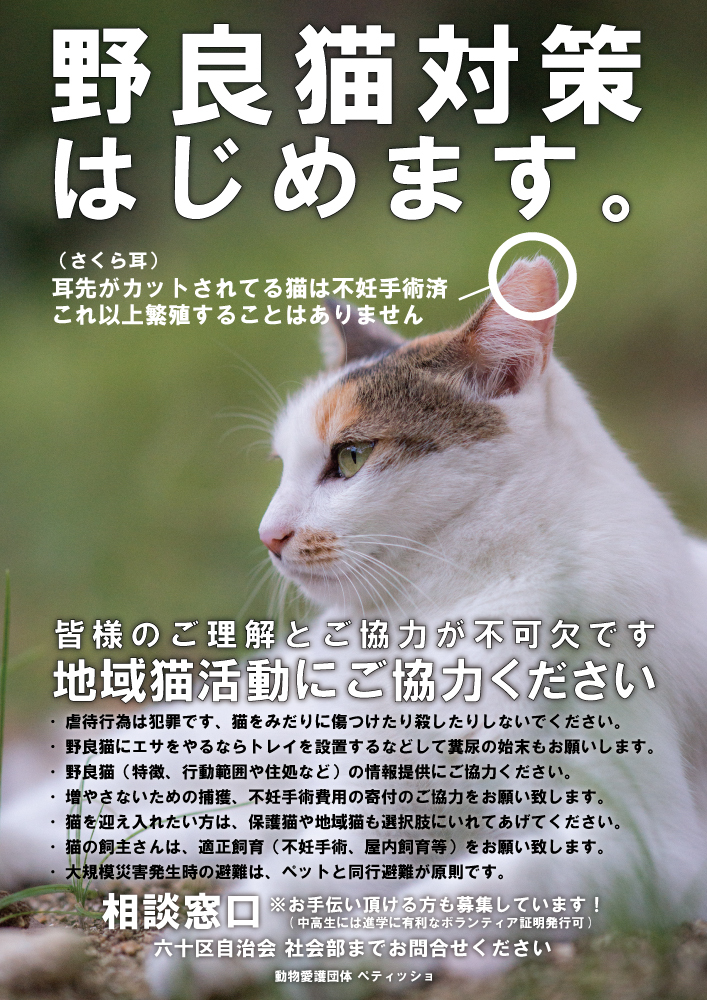 地元自治会の地域猫活動ポスター、パンフレット等などで地域住民への周知をはかります