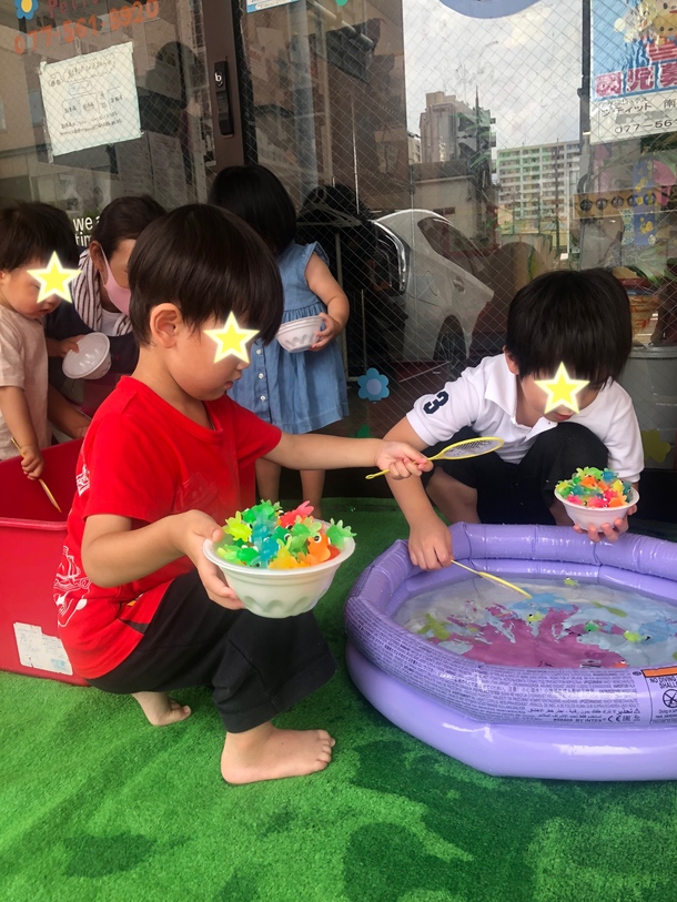 今日は、雨の七夕となりましたね。ルームのたなばた会は、お星様探しや金魚すくいを楽しみました。お部屋とお外なので、2グループに分け交代交代で楽しみました。お星様探しでは、ルーム内は大騒ぎ(笑)金魚すくいは、みな黙々と(笑)本当に、みんな可愛い。