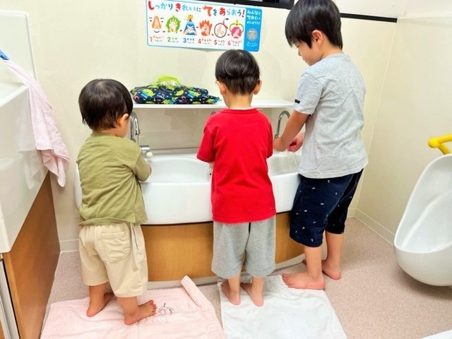 並んで仲良く手洗いする姿を毎日見ることができとても嬉しく、そして衛生面を意識し、子供たち同士の言葉がけや関わりあいが、これからますます楽しみです。