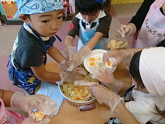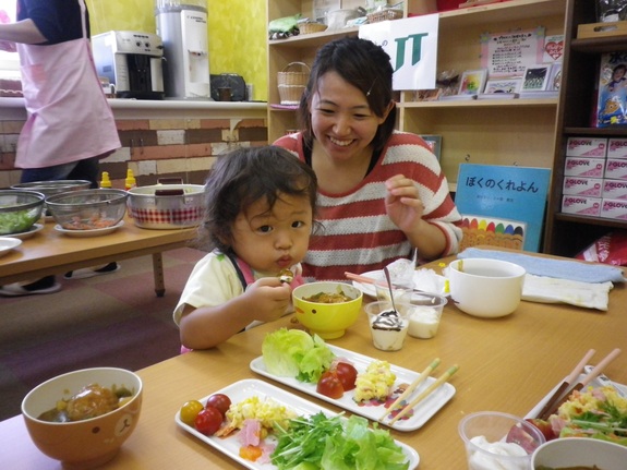 私たちひろば内でも、ランチタイムは現在とても大事なコミュニケーションの時間です。大人数で食べることの楽しさをお母さんも子どもも感じ、「料理を作る」「こどもの好き嫌いなく食べてもらう」ことなどの悩みもそこで共有共感し、笑い声の絶えない時間となっています。また時折食育講座や親子料理教室でも、初めての親子の共同作業に、子どもの「やりたい」気持ちをはぐくんでいくことができます。