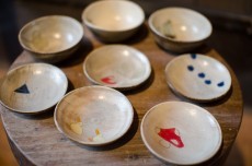 会津本郷焼の起き上がり小法師デザイン箸置き2個と豆 皿3枚セット