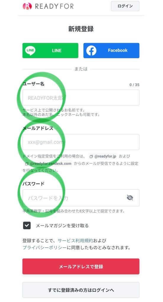 ③「ユーザー名」「メールアドレス」「パスワード」を入力→「メールアドレスで登録」