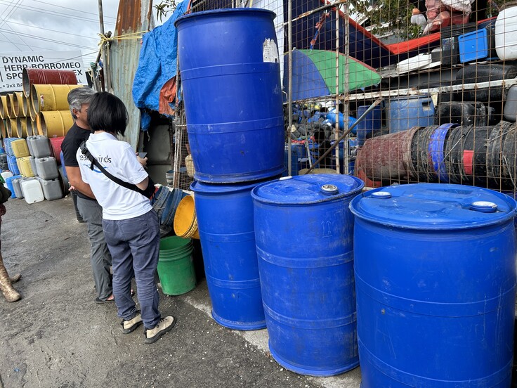 前日までの調査で顕著な水不足を確認していた私たちは、8日、まず貯水タンクを購入して先日訪れた避難所に設置しました。この日のセブ島は朝から激しい雨。水はけの悪い場所にはあっという間に深い水溜まりができていました。