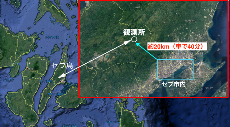 セブ市内から約20km(セブ市の海岸から直線で西へ13㎞)、