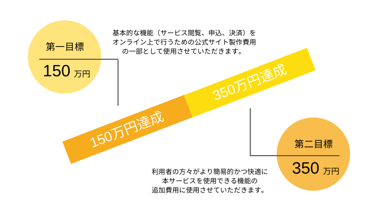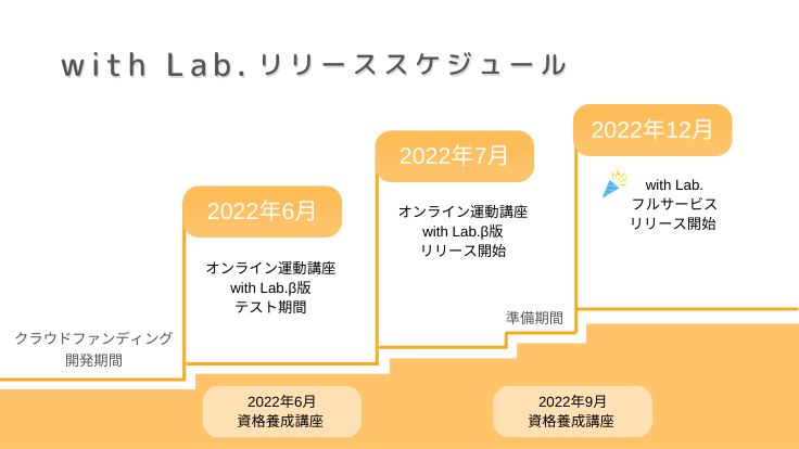 2022年7月にオンライン運動講座《with Lab.》β版のサービスリリース 2022年12月に《with Lab.》のフルサービスリリース 【第一目標:150万円】 with Lab.公式ウェブサイトの制作費用 基本的な機能(サービス閲覧、申込、決済)をオンライン上で行うための 公式サイト製作費用の一部として使用させていただきます。 ・公式ウェブサイト製作費用:約120万円 ・ READYFOR利用手数料や税金等:約30万円 【第二目標:350万円】 第二目標でいただくご支援では利用者の方々がより簡易的かつ快適に 本サービスを使用できる機能の追加費用に使用させていただきます。 ・公式サイトから利用ページまでワンステップで利用できる利便性の向上 ・マイページ機能追加により視聴動画履歴や検索機能を向上させ、見たい、知りたい情報にすぐアクセスできる ・配信動画コンテンツの高品質化