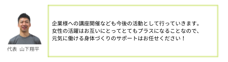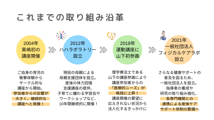 2018年から理事寅嶋の産後女性の骨盤ケア講座へ参画し、現在は当団体の産前産後女性のための運動講座の企画運営を行っている。