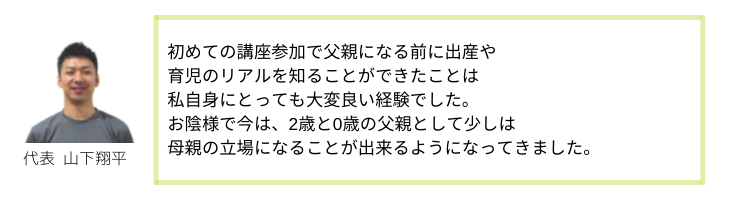 私山下は理学療法士として、10年間病院や整形外科に勤務していました。その経験を最大限に生かし、また三児の父親の立場からも、積極的にお母さま方の支援に取り組もうと、日々研鑽を重ねています。