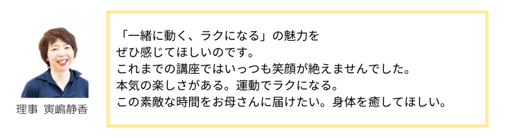 そのような不安やお悩みの解決の一助となれるよう、当団体理事である寅嶋静香は17年以上、これまで多くの産後の女性に対する運動講座を行なってきました。