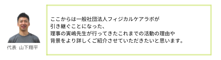 初めまして。一般社団法人フィジカルケアラボ(以下当団体)代表理事を務める山下翔平と申します。