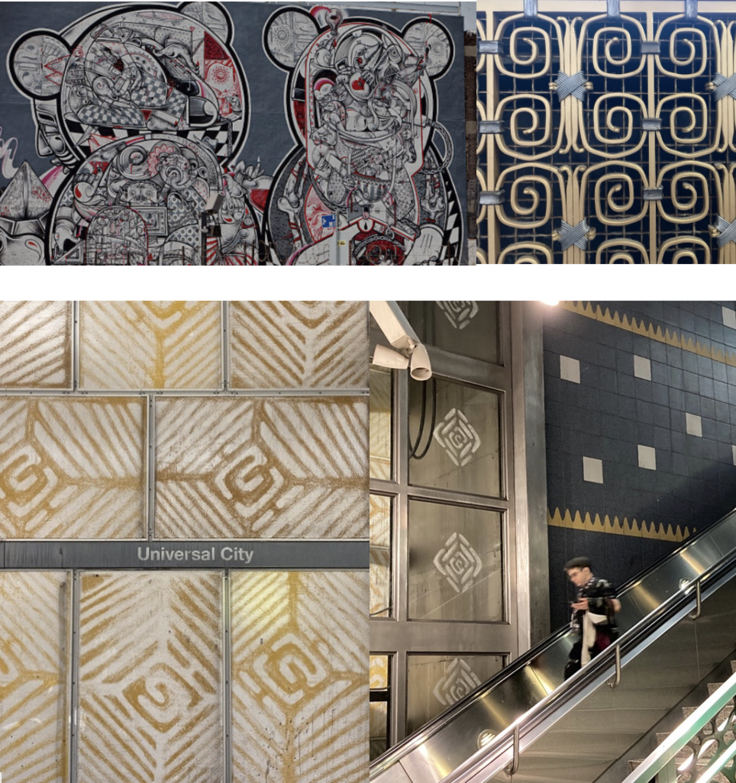 上:壁に描かれたグラフティーとユニオン駅の空調グリル 下:地下鉄ユニバーサルシティ駅の壁面デザイン