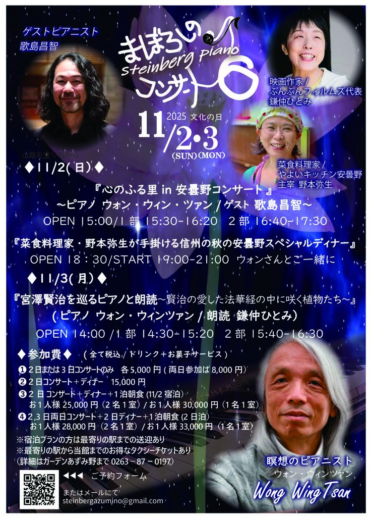 信州安曇野にもふさわしく、自然を愛し、植物を愛し、生き物を愛し、人が生きる為のバイブルともいえる法華経を愛した宮沢賢治さんの心感じる詩を朗読しながらのウォンさんのピアノ演奏となります。