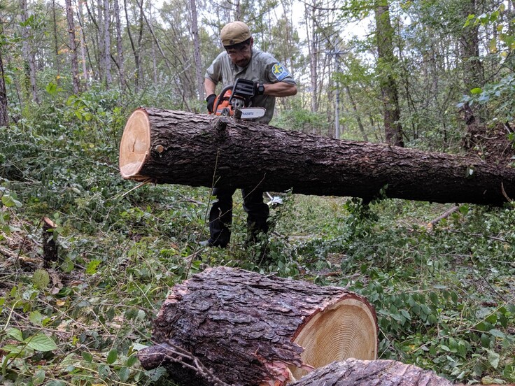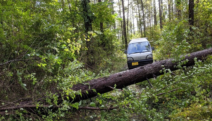私は大急ぎで3頭の犬を車に積み、森の奥深くにある小屋から命からがら逃げ出しました。逃げる途中も車の周りで木々がどんどん倒れ、それをかい潜るように脱出したことを今でもよく覚えています。