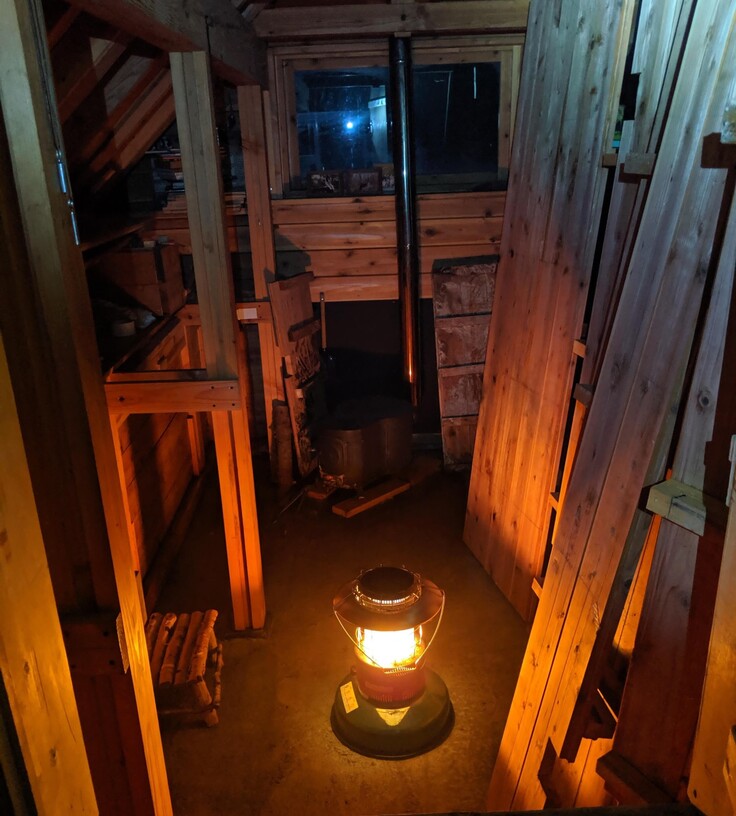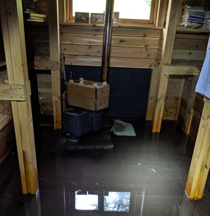 車を止めて、歩いて小屋まで行き、竪穴内部をみると、床上90cmほど浸水していました。でも、小屋が倒木による倒壊を免れたのは不幸中の幸いでした。