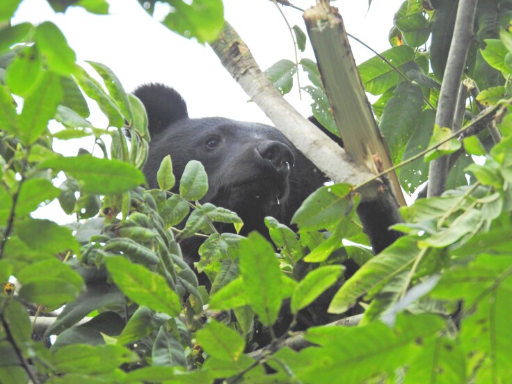 (写真)クルミの実を採食後、樹上で休憩するクマ