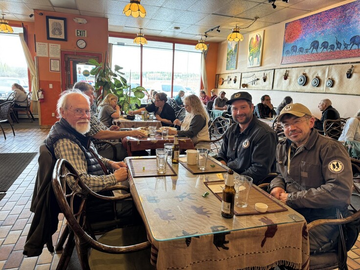 John Hechtelさん(写真左)とDick Shidelerさん(写真中央)です。ジョンさん、ディックさんともに、アラスカ州魚類野生生物局 のクマ生態学者として、長きに渡りクマの研究と保全活動に貢献されこられた方々です。